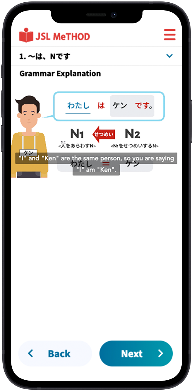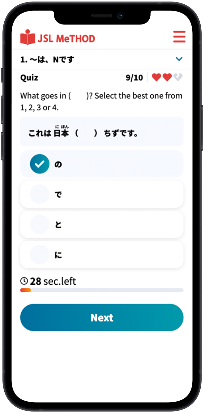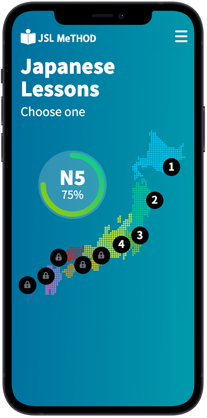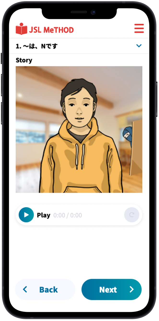The JSL MeTHOD is an efficient tool for learning key Japanese grammar patterns. Watch easy-to-understand videos and engaging stories, then measure your comprehension by completing quizzes. The JSL MeTHOD helps you gain a deep understanding of the Japanese language.